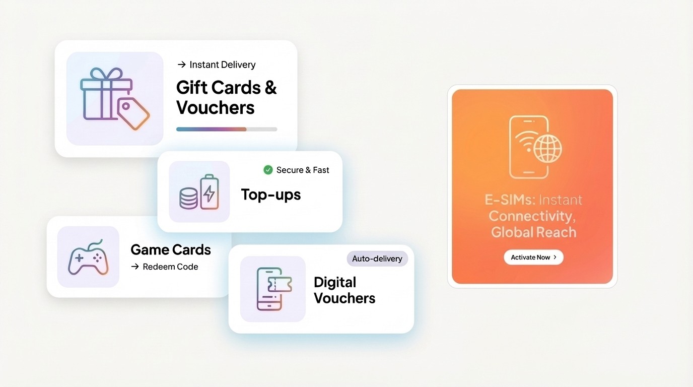 Gift cards, top-ups, vouchers, game cards, e-SIMs