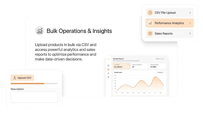 Upload products in bulk via CSV and access powerful analytics and sales reports to optimize performance and make data-driven decisions.